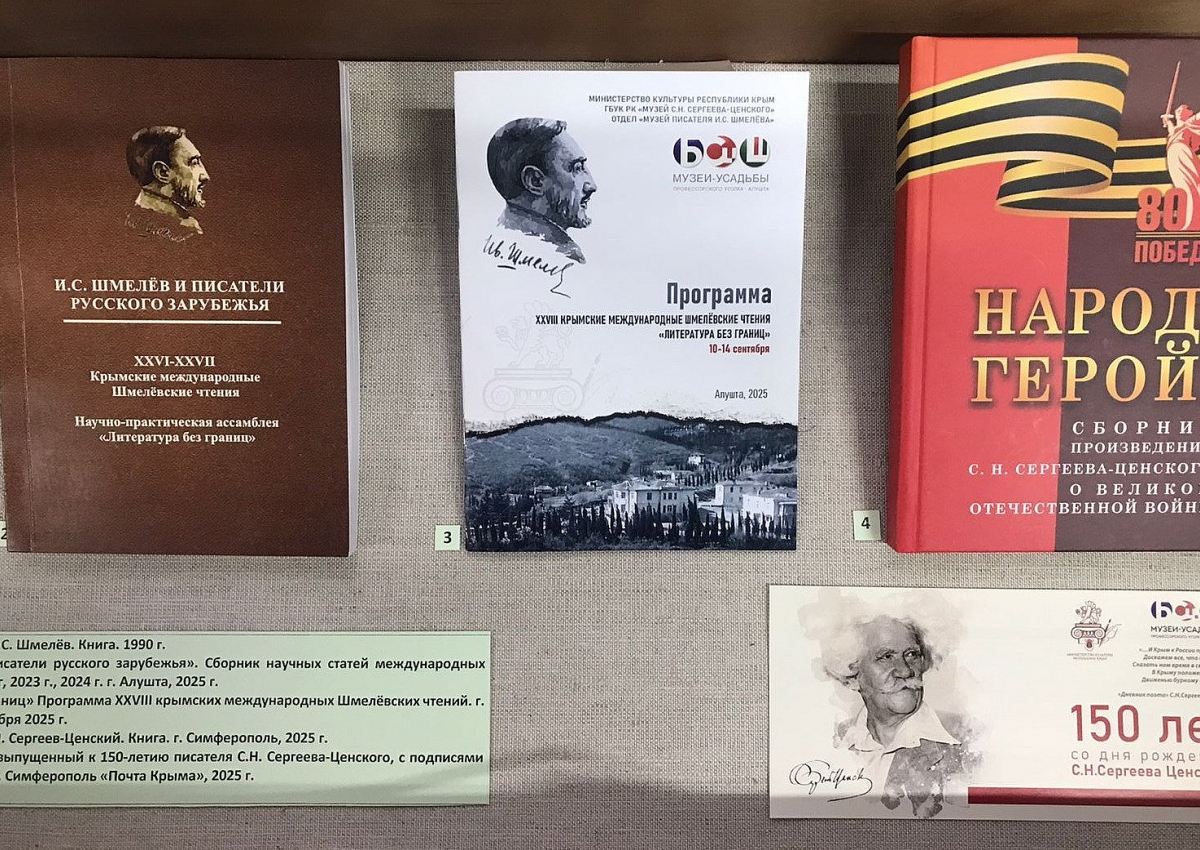 Книга «Лето Господне», 1990 год - автобиографический роман русского писателя Ивана Шмелёва, написанный в 1927 –1948 годах. Сборник докладов XXVI и XXVII Крымских международных Шмелевских чтений, программа XXVIII Крымских международных Шмелевских Чтений, 2025. Материалы, связанные с 150-летием со дня рождения С.Н. Сергеева-Ценского – почтовый конверт, изготовленный АО «Марка» по фондовым материалам музея, с подписями официальных лиц, буклеты к выставкам «Певец боевой славы» и «Богатырь русской литературы». Экспозиция раскрывает тему современного развития музея.