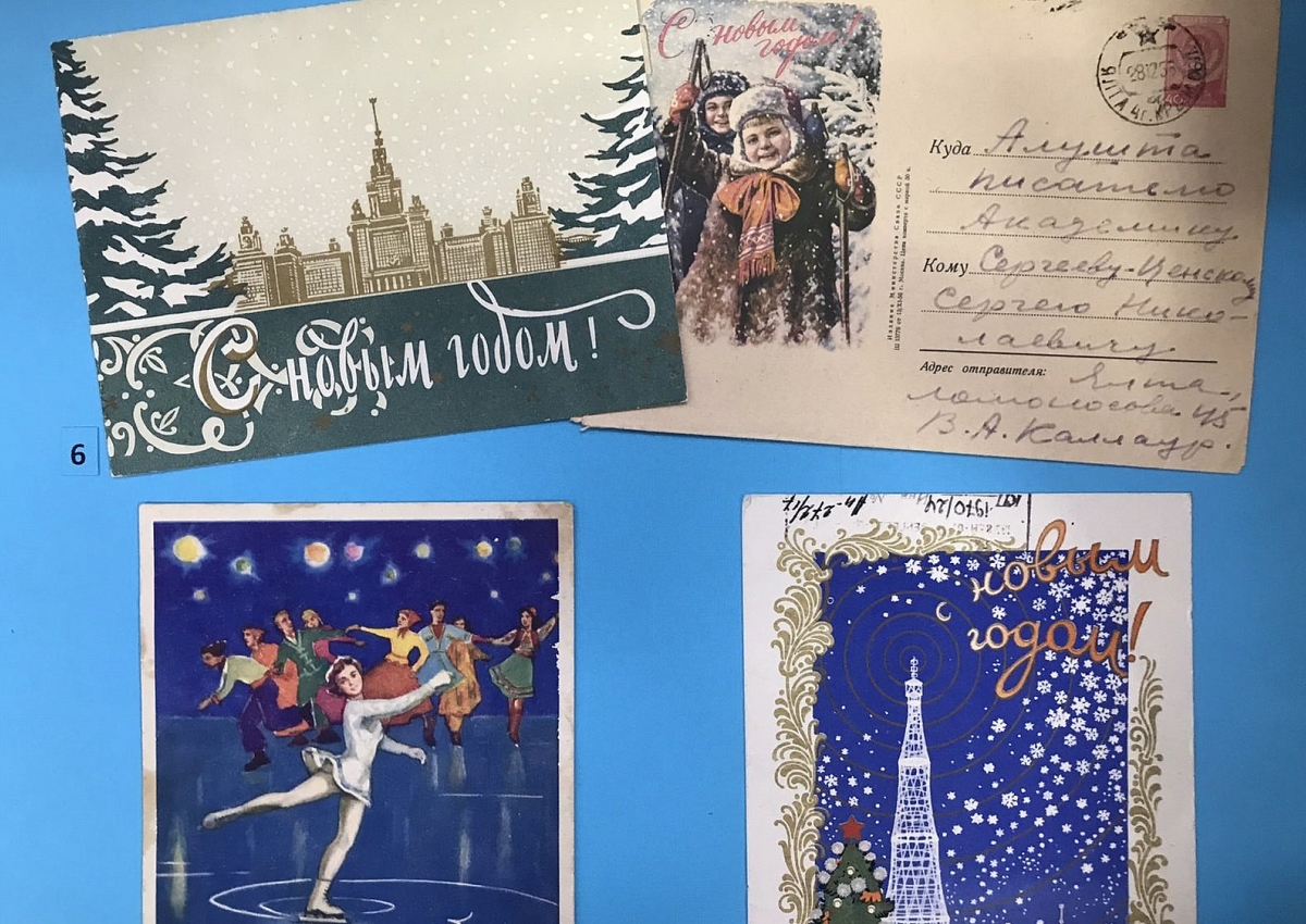 На ней представлена коллекция уникальных старых новогодних открыток и поздравительных писем 1950-1960-х годов от родственников и друзей, детей и взрослых, организаций, коллективов и собратьев по перу.