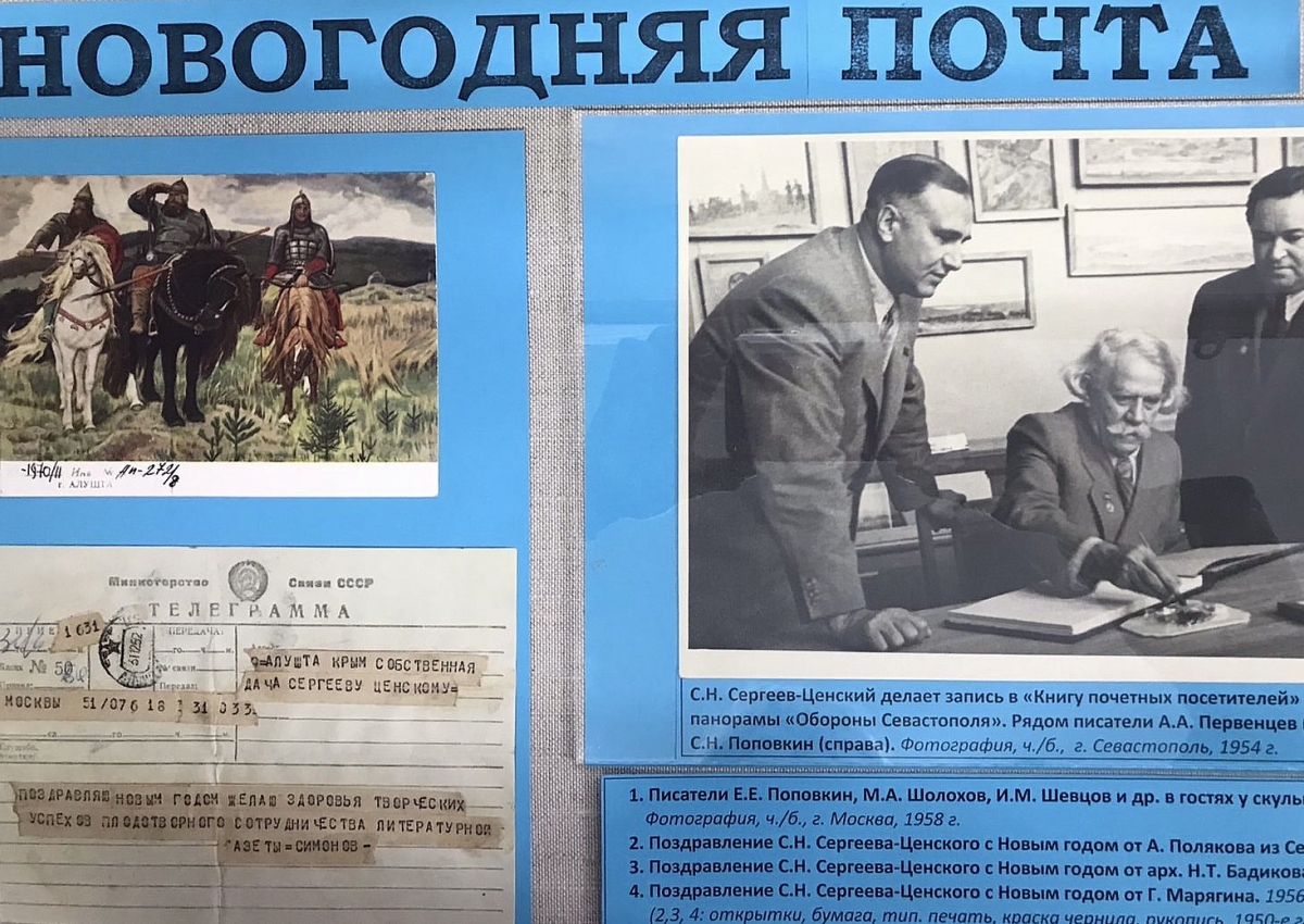 Окунуться в праздничную атмосферу Рождества и Нового года позволила выставка из фондов музея «Новогодняя почта», состоявшаяся 18 декабря 2025 года в республиканском музее С.Н. Сергеева-Ценского, «писательской мастерской» признанного мастера слова.